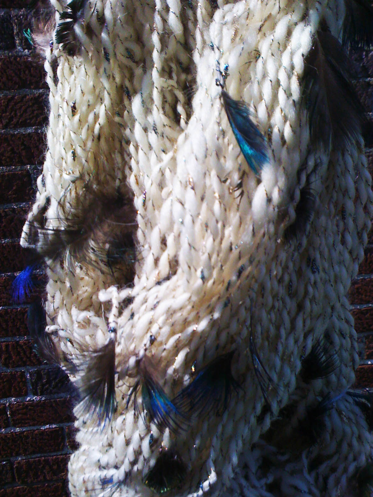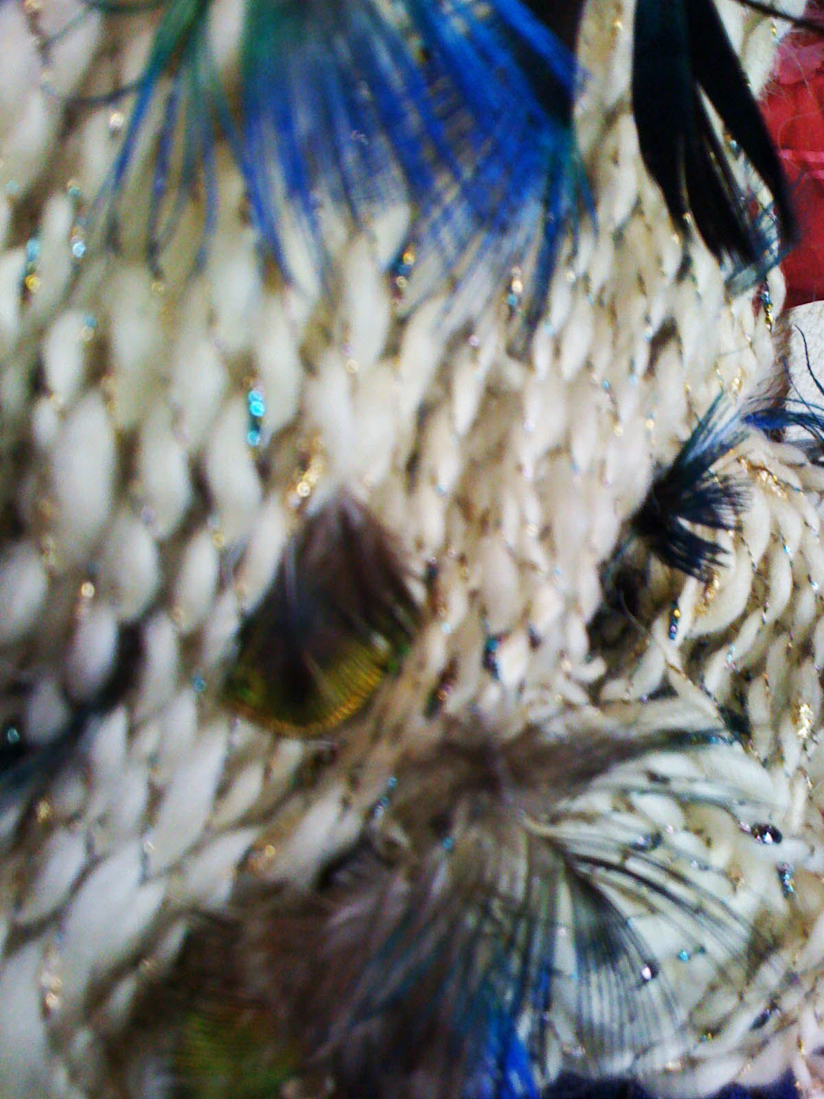 Just for fun … glamorous wool handspun with teeny-tiny peacock feathers and a bit of sparkle!  These little lovelies come from Galyna Batewell of Ethridge, TN ~ an absolutely wonderful lady to chat with!